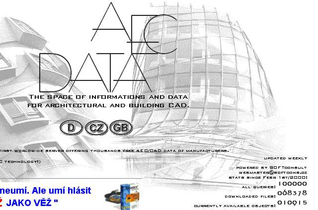 15.3.2001 v 16.42 středoevropského času bylo docíleno 100.000 dotazů na 1. Internet serveru poskytující 2D/3D objekty a textury výrobců. Server byl spuštěn 1.3.2000 a získal své uživatele po celém světě. Poskytuje 10.915 konkrétních výrobků ve formátech pro AEC systémy, informace o grafických datech pro projektanty na WEBu a CD ROMech. Grafická data poskytuje od 71 výrobců, hlavně z oblasti vybavení koupelen, nábytku, stavebních konstrukcí, povrchů, výplní otvorů a tzb. Nejvíce jsou stahovány objekty ve formátech pro ArCon a 3D-Studio. Největší návštěvnost je v současnosti z České republiky a USA. Hodnoty které uvádíme se samozřejmě nedají srovnávat se servery pro širokou veřejnost. Služby které poskytujeme jsou však určeny jen jedné odborné skupině, a proto jsme s vývojem spokojeni. Server naplňuje naše představy o rozvoji projektu AEC-DATA.